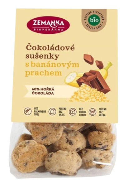 Objavte jedinečnú chuť bio sušienok z Biopekárna Zemanka, v ktorých sa spája kvalitná horká čokoláda s jemne sladkým banánovým práškom.