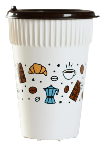 FARBA: béžový pohár s kávovými ilustráciami, hnedé viečko s pítkom