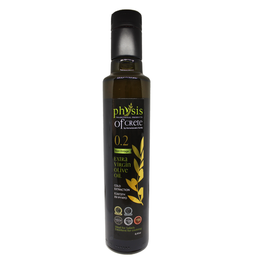 Extra panenský olivový olej z Kréty a asiditou 0,2%, vyrobený lisovaním za studena z olív odrody Koroneiki.